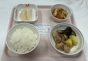 今回の献立は「米飯」、「鶏肉さんしょう焼き」、「源平煮」、「梨」です。「米」、鶏肉さんしょう焼きの「とりもも肉」とその付け合わせの「なす」が県産品です。(県産品の使用率は51.8%となっています。)