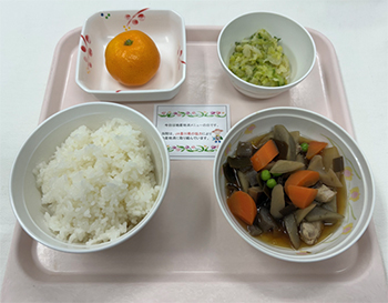 今回の献立は「米飯」、「筑前煮」、「キャベツのごま酢和え」、「みかん」です。「米」、筑前煮の「とりもも肉」、「みかん」が県産品です。(県産品の使用率は56.8%となっています。)