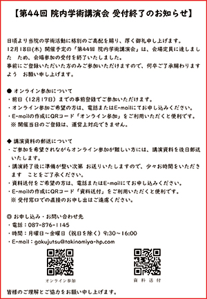 令和7年12月18日(木)14:30から開催の「第44回 院内学術講演会」受付終了のお知らせです。