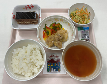 令和7年12月24日(水)、患者さまに少しでもクリスマスの雰囲気を感じ、楽しんでいただけるよう、夕食に「行事食」としてクリスマスのお食事を提供しました。