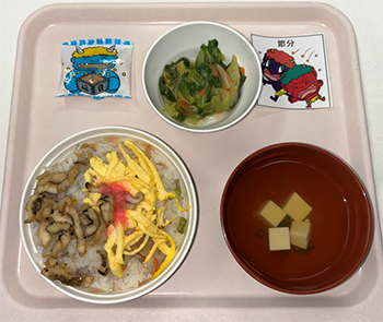 今回の献立は「ちらし寿司」、「たらこ和え」、「清汁」、「節分豆」です。