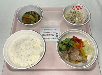 今回の献立は「米飯」、「若鶏焼きたたき」、「マカロニサラダ」、「煮浸し」です。「米」、若鶏焼きたたきの「とりもも肉」、付け合わせの「レタス」、煮浸しの「まな」が県産品です。(県産品の使用率は64.1%となっています。)