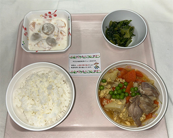 具材の組み合わせとしては「肉じゃが」に近い印象もありますが、卵が入ることで、たんぱく質量が増え、味わいもやさしくまとまります。鶏肉の旨味と野菜の甘み、そして卵のまろやかさが一体となり、食べやすく、入院中の患者さまにも無理なくお召し上がりいただけるよう工夫しています。